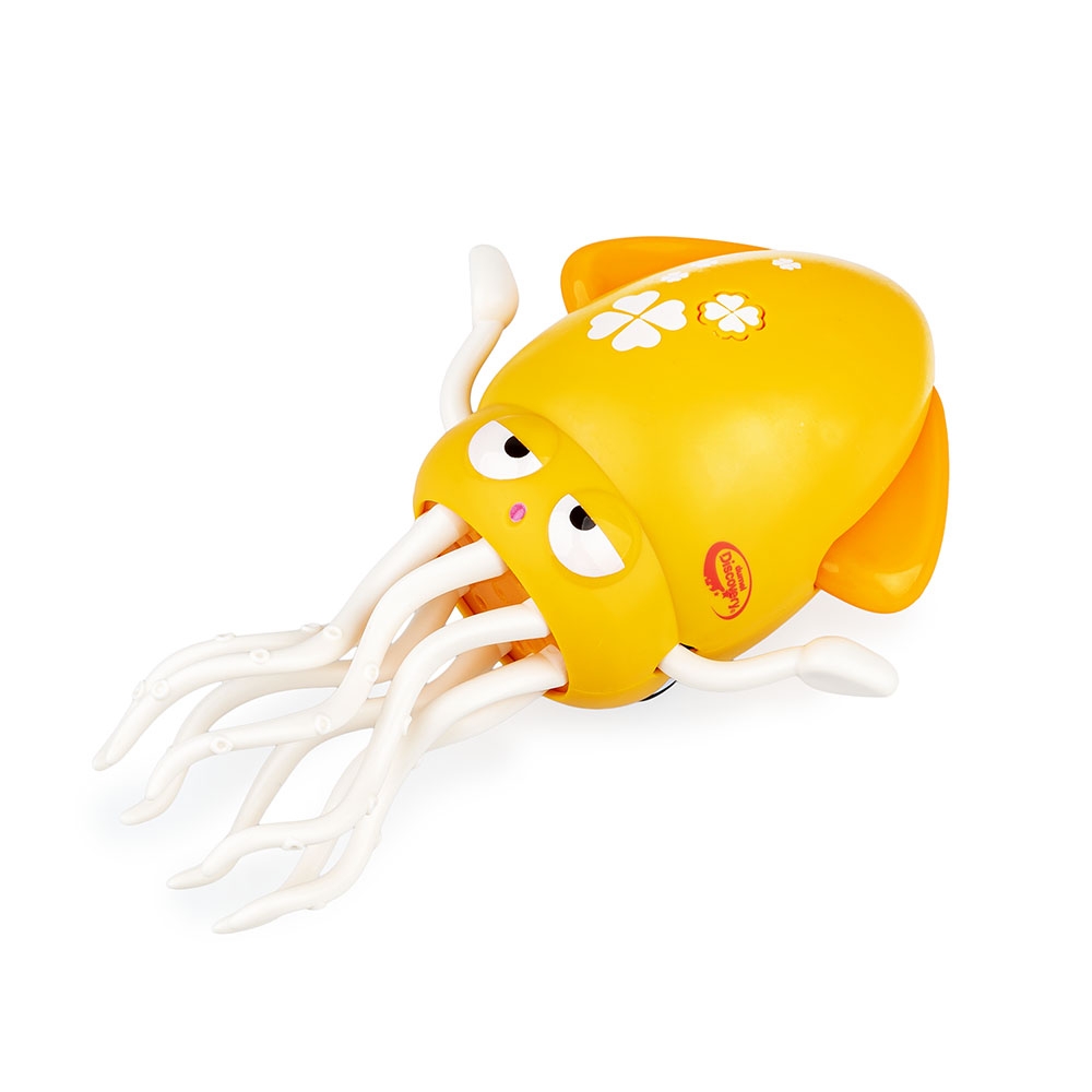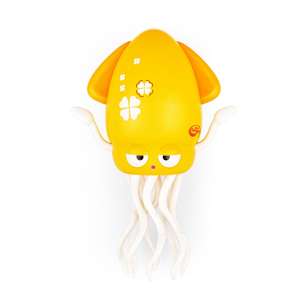 Żółciutka animatorka zaprasza do zabawy! Kałamarnica posiada ruchome odnóża, które, w zależności od tego w jakiej pozycji ustawimy zabawkę, pozwalają jej poruszać się w różny sposób. Kiedy kałamarnica stoi na odnóżach, tańczy w miejscu, a gdy leży płasko, przemieszcza się do przodu i do tyłu. Specjalny czujnik, znajdujący się na czubku głowy kałamarnicy, pozwala jej wykrywać przeszkody. Zabawka odtwarza piosenkę w języku polskim oraz wesołą melodię, a jej płetwy świecą kolorowo. Praktyczny przełącznik pozwala przestawić zabawkę na tryb poruszania się bez dźwięku lub na jej całkowite wyłączenie.