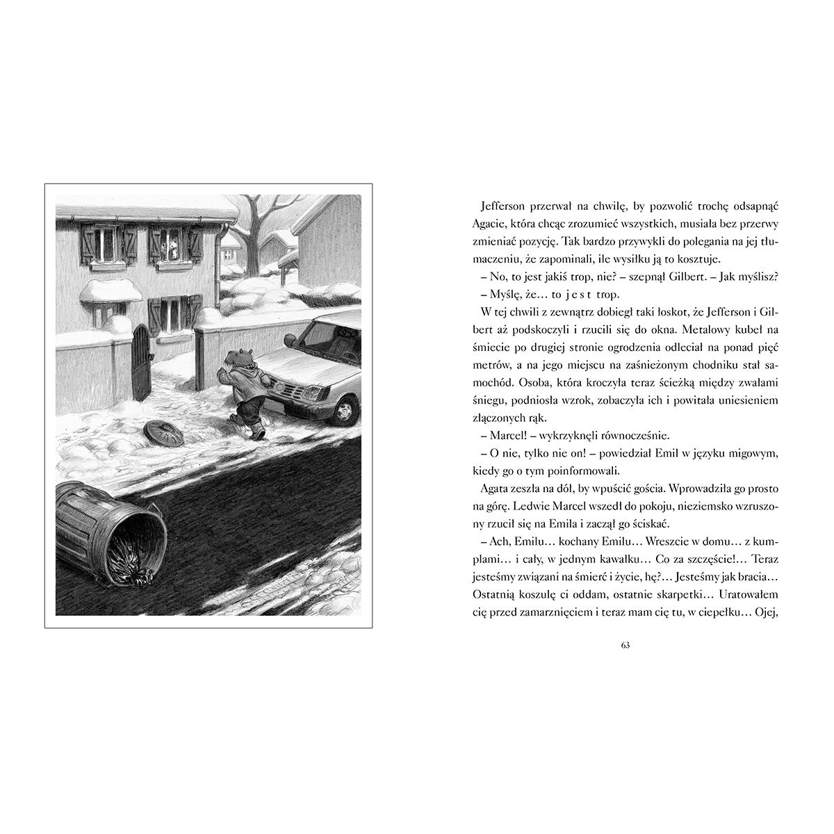 Pewnego ranka jeż Jefferson, odśnieżając podjazd do garażu ze swoim przyjacielem, prosiakiem Gilbertem, zauważa wystający ze śniegu but. W bucie znajduje się wełniana skarpeta. W skarpecie znajduje się stopa. A na końcu stopy – kot Emil, fotograf. Przemarznięty i nieprzytomny.