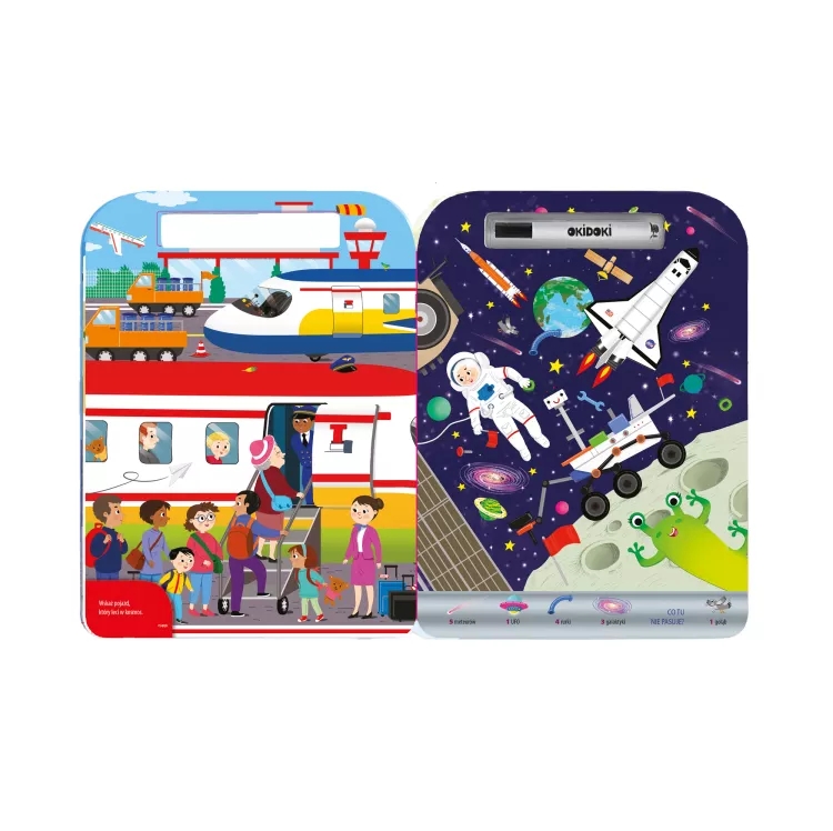 Zeszyt edukacyjny dla dzieci z różnymi zadaniami i zmazywalnym pisakiem. Rozwijaja spostrzegawczość, koncentrację i motorykę małą.