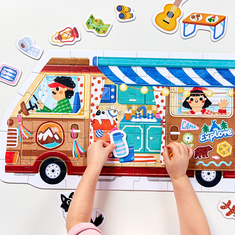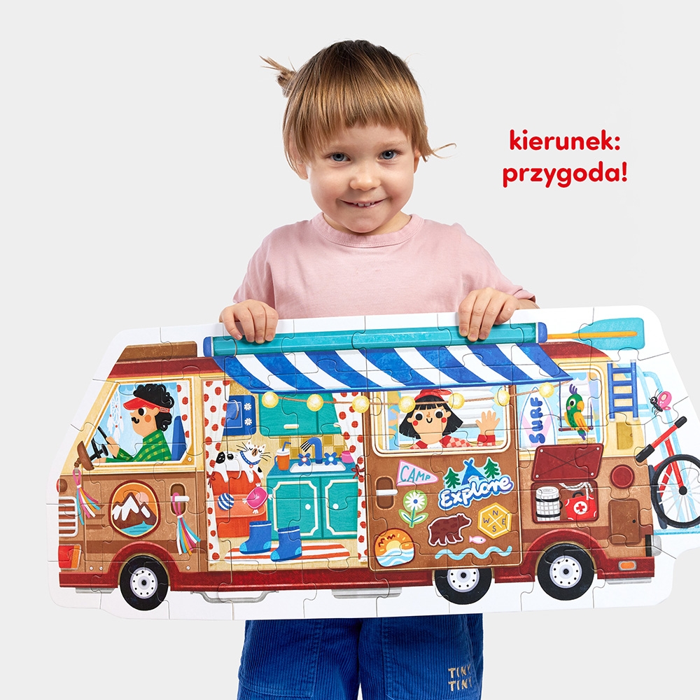 Imponujący, kolorowy i pełen detali puzzlowy kamper składa się z 40 puzzli. Ich ułożenie to dopiero początek przygody. Do pojazdu dołączono 18 dokładanych obrazków, które przedstawiają przydatne na kempingu przedmioty, oraz poradnik z pomysłami na zabawy. Edukacyjny zestaw to doskonały pomysł na mądry prezent dla ciekawego świata przedszkolaka i inspiracja do wielu rozwijających zabaw.