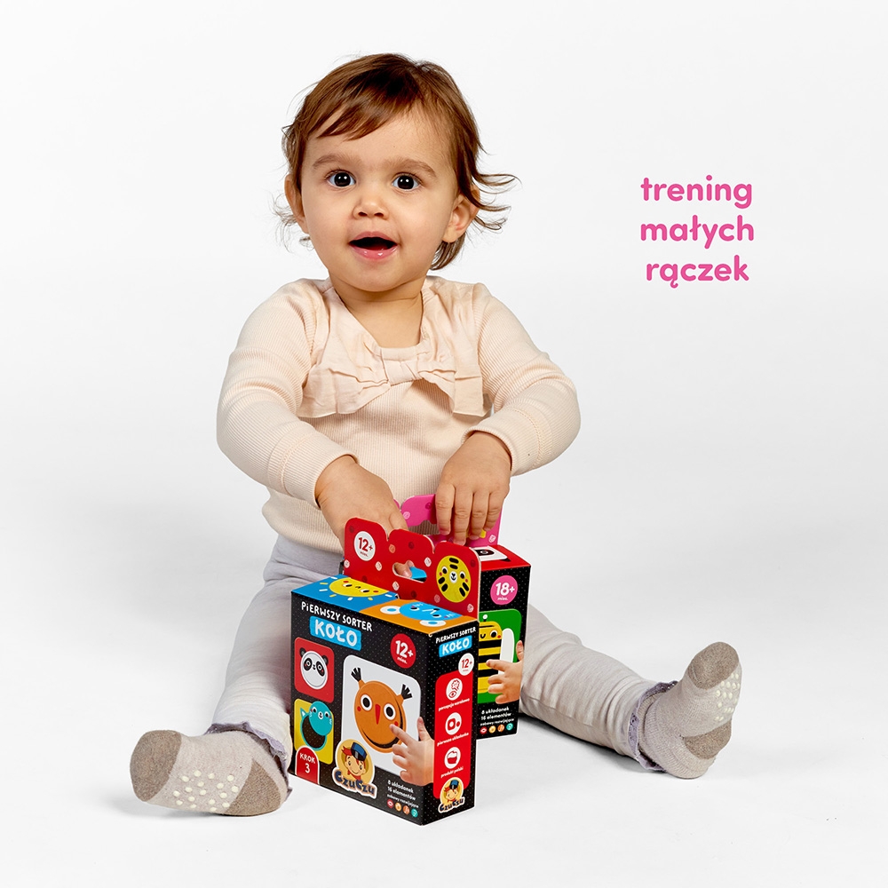 Pierwszy sorter KSZTAŁTY od CzuCzu to świetny pomysł na pierwsze trudniejsze układanki i sorter kształtów dla półtorarocznych dzieci. Pokaż dziecku, jak dokładać elementy. Możesz najpierw to zrobić jego rączkami. Wskazuj i nazywaj kształty, kolory, opowiadaj o tym, co widać na ilustracjach. To świetny pomysł na poznawanie i utrwalanie nowych słów i to, by krok po kroku rozwijać sprawność dłoni, spostrzegawczość i razem poznawać świat.