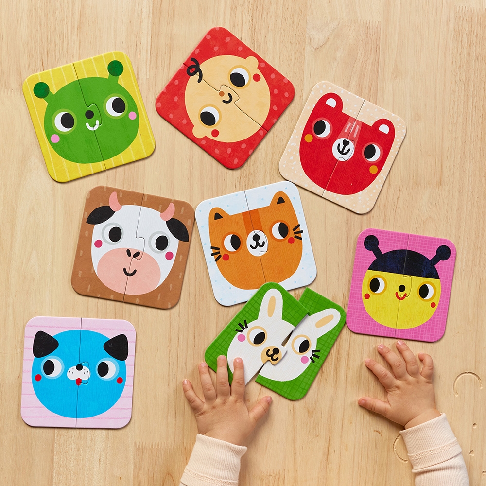 Edukacyjne dwuelementowe układanki sprawdzą się doskonale jako pierwsze proste puzzle dla maluchów. Zabawa polega na odnalezieniu i połączeniu symetrycznych połówek, choć możliwe są nieoczywiste kombinacje. Proste, urocze ilustracje inspirują do mnóstwa wszechstronnie rozwijających aktywności.
