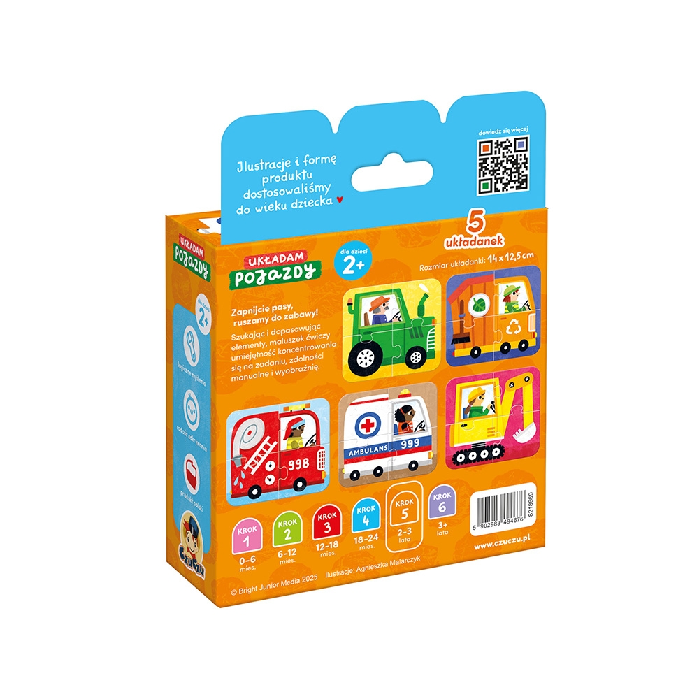 Urocze ilustracje przedstawiają znane i lubiane przez najmłodszych pojazdy: jest tu karetka, wóz strażacki, śmieciarka, koparka i traktor! Każdy obrazek składa się z 4 puzzli, dlatego zestaw doskonale znakomicie sprawdzi się u maluchów, które początek układania mają już za sobą. Bawcie się na wiele sposobów!