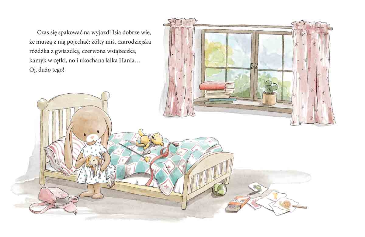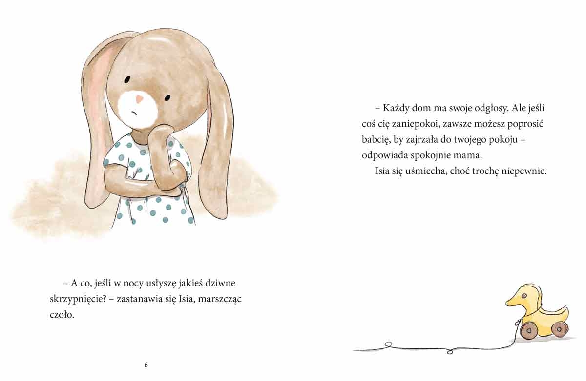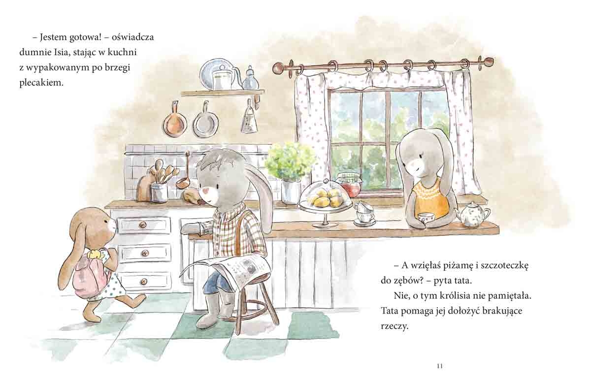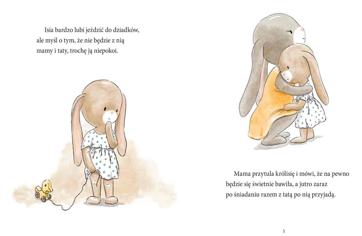 Isia po raz pierwszy w życiu ma spędzić cały dzień i noc bez rodziców u babci i dziadka! Bardzo lubi tam jeździć, ale tym razem trochę się niepokoi. Bo co, jeśli mama i tata będą za nią tęsknić? Albo ona sama w nocy usłyszy jakieś dziwne skrzypnięcie? Na wszelki wypadek lepiej zabrać trochę ulubionych rzeczy, na przykład żółtego misia czy ukochaną lalkę Hanię. Z nimi u boku oraz dzięki wsparciu dziadków króliczka dużo łatwiej poradzi sobie z tęsknotą za rodzicami!