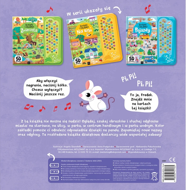 Pięć bogato ilustrowanych rozkładówek ze zwierzętami, pojazdami i ciekawymi miejscami w mieście: na starówce, w parku, na ulicy, w centrum handlowym i w parku wodnym. Oglądaj ilustracje, a potem odpowiadaj na zadane pytania, szukaj wskazanych zwierzaków, pojazdów i innych elementów ilustracji, a przede wszystkim słuchaj ponad 50. odgłosów. Kolor zakładki pomoże ci odnaleźć odpowiednie dźwięki na panelu. Aby włączyć nagranie, naciśnij kółko. Chcesz wyłączyć? Naciśnij kółko jeszcze raz. Zapamiętaj nazwy pojazdów i dźwięki ich silników, a także nazwy zwierząt oraz przedmiotów i urządzeń, które można spotkać w mieście, i wydawane przez nie odgłosy.