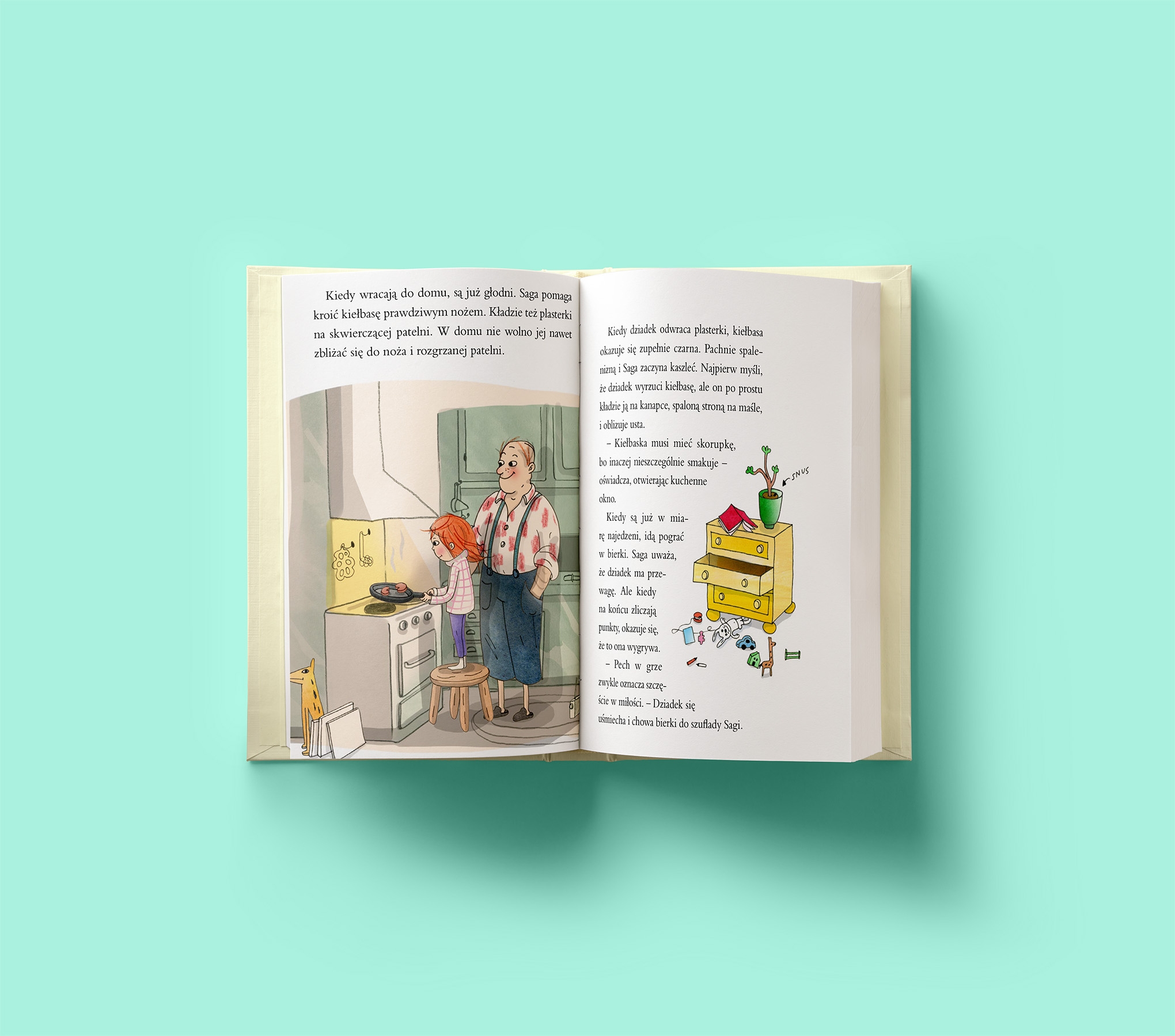 Saga Larsson ma pięć lat i mieszka z rodzicami przy ulicy Słonecznikowej. Pewnego dnia dziewczynka jedzie na nocowankę do dziadka. Po raz pierwszy będzie spać poza domem bez mamy i taty. Trochę ją to niepokoi, ale lubi odwiedzać dziadka, bo mogą razem robić, co chcą! Kiedy jednak dziadek ścieli rozkładaną kanapę, Saga mówi: stop! Nie chce spać sama, chce spać z dziadkiem!