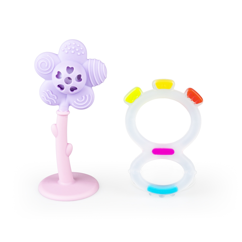 - w zestawie 2 zabawki: gryzak Ósemka i grzechotka Radosny Kwiatek fioletowy;