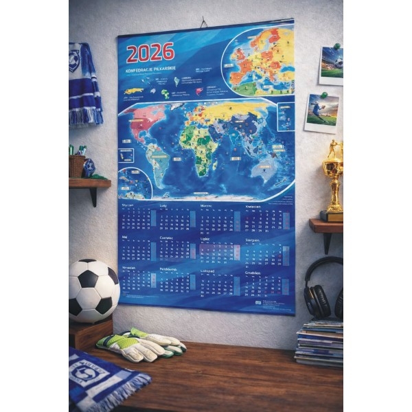 Na jednej stronie znajduje się przejrzysty terminarz meczów MŚ 2026 z miejscem do uzupełniania wyników oraz oznaczania drużyn awansujących do kolejnych etapów turnieju przy użyciu naklejek z dołączonej książeczki. Na odwrocie umieszczono praktyczny kalendarz na rok 2026 oraz mapę świata z zaznaczonymi konfederacjami piłkarskimi. Zestaw uwzględnia również etap barażowy w zakresie informacyjnym.