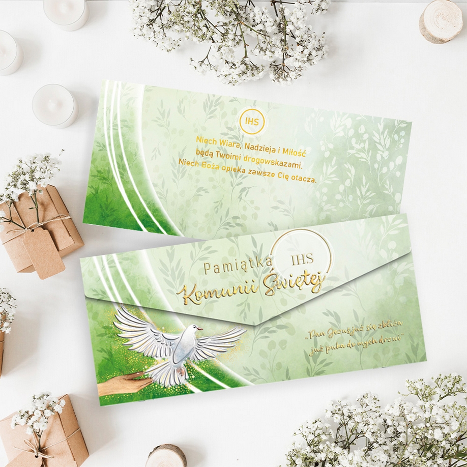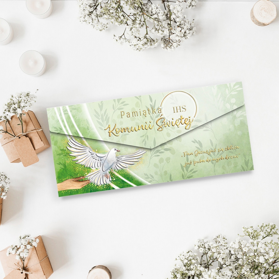 Koperta Komunia GOŁAB NA DŁONI wydrukowana na wysokiej jakości papierze formatu 25,7 x 11,9 cm. Koperta uszlachetniona złotem i tłoczona. W środku kartka z tekstem życzeń uszlachetniona złotem. W zestawie biała koperta.