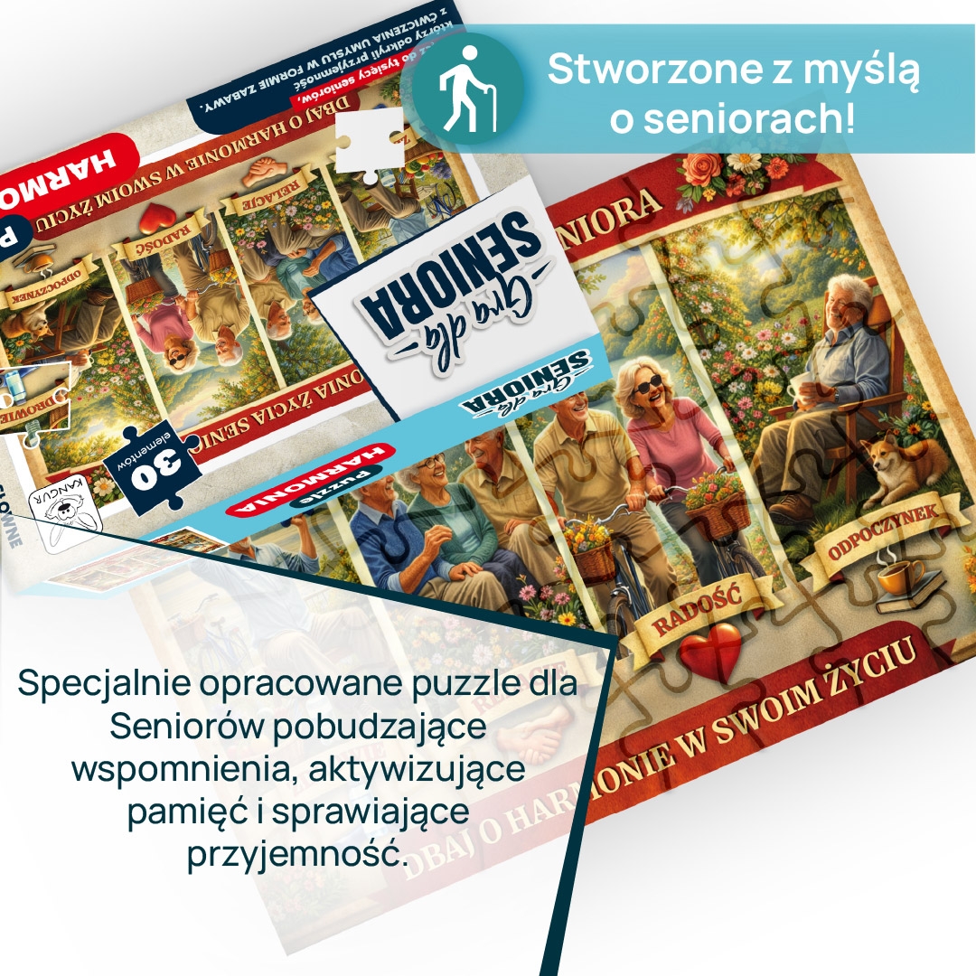 Specjalnie opracowane puzzle dla Seniorów pobudzające wspomnienia, aktywizujące pamięć i sprawiające przyjemność w układaniu. Seria gier Dla Seniora wspomaga koncentrację, zapobiega demencji, pobudza wspomnienia, aktywizuje samodzielność i łączy pokolenia.
