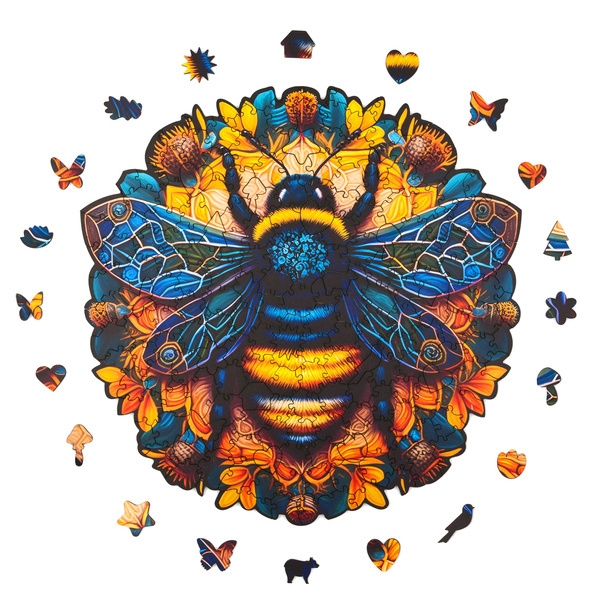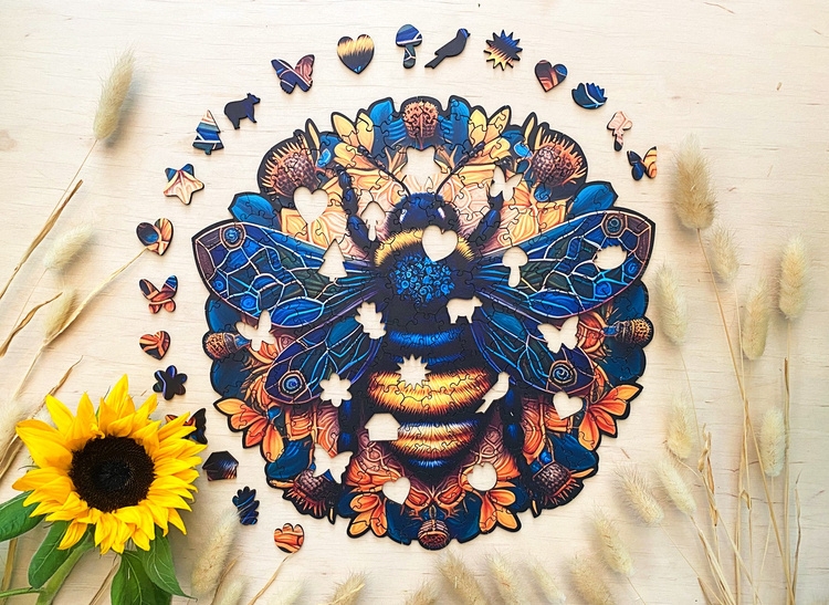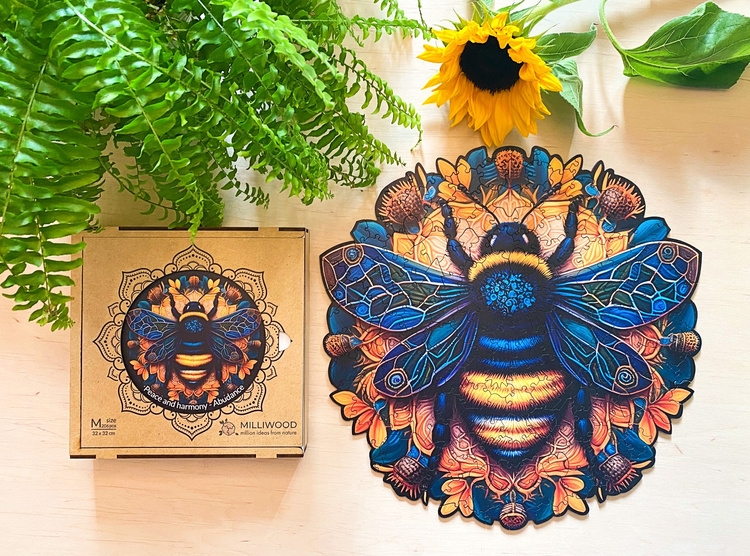 W samym centrum tej kwiecistej mandali, jak klejnot, znajduje się majestatyczna pszczoła – symbol życia, pracy i harmonii. Jej obecność dodaje tym puzzlom nie tylko estetycznego piękna, ale również przypomina o znaczeniu każdego drobnego detalu i roli, jaką odgrywamy w tkance życia.