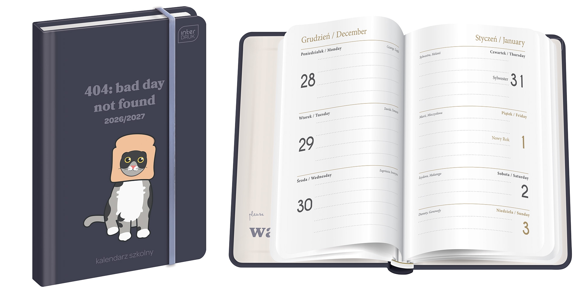 - Dodatkowo w środku kalendarza: kalendarz skrócony, planer miesięczny, plan lekcji, miejsce na własne notatki i kontakty oraz lista ważnych dat i świąt.