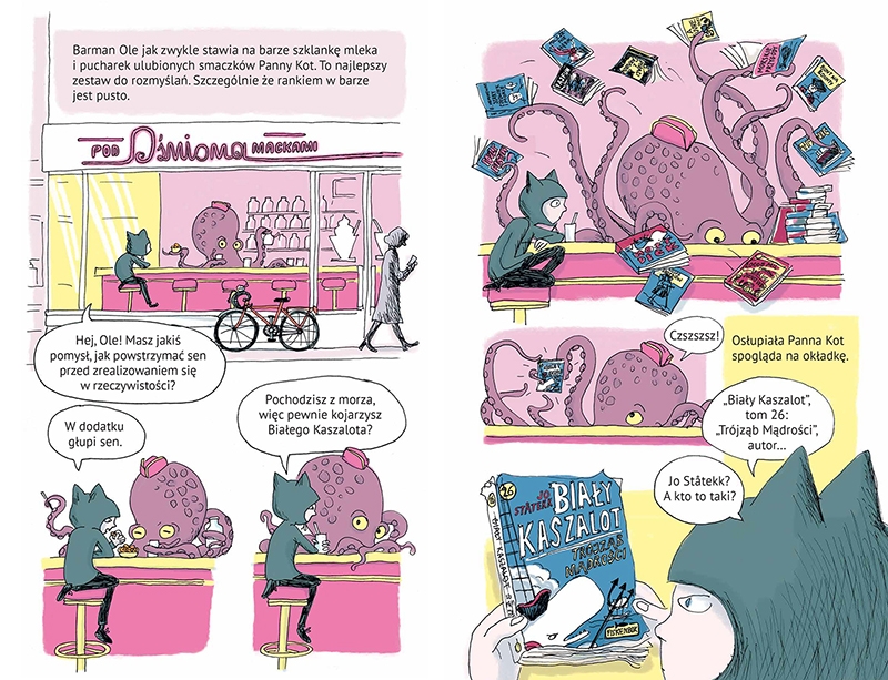 Dynamiczna forma komiksu stylizowanego na skandynawski kryminał, wyrazista kreska Joëlle Jolivet i błyskotliwe dialogi Jeana-Luca Fromentala sprawiają, że od przygód Panny Kot nie sposób się oderwać. To idealna propozycja dla dzieci rozpoczynających samodzielną przygodę z czytaniem oraz dla wszystkich, którzy lubią tajemnice, czarny humor, osobliwych bohaterów i wciągające detektywistyczne śledztwa.