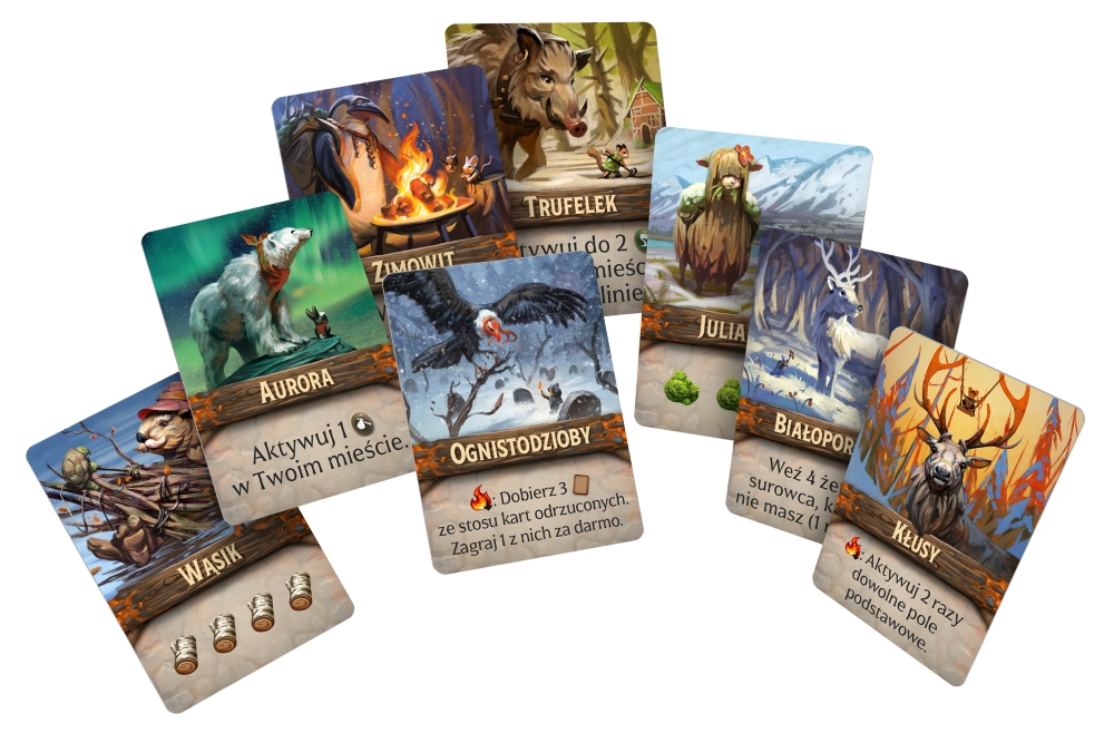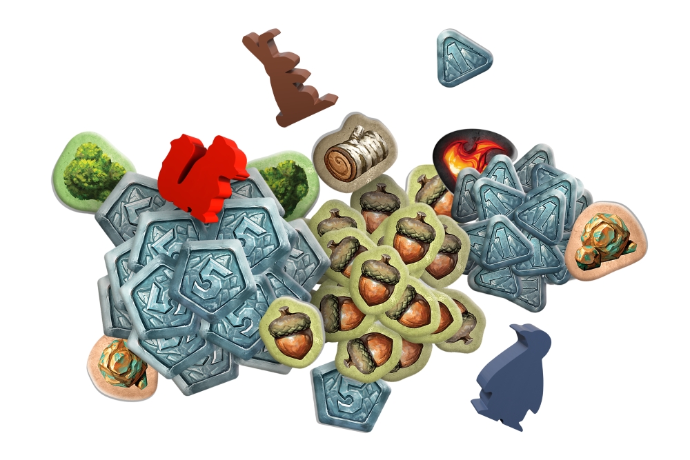 - różne dodatkowe żetony (śnieg, ogień, konary brzozy, kępki mchu, grudki miedzi, żołędzie, punkty, żetony Łapy)