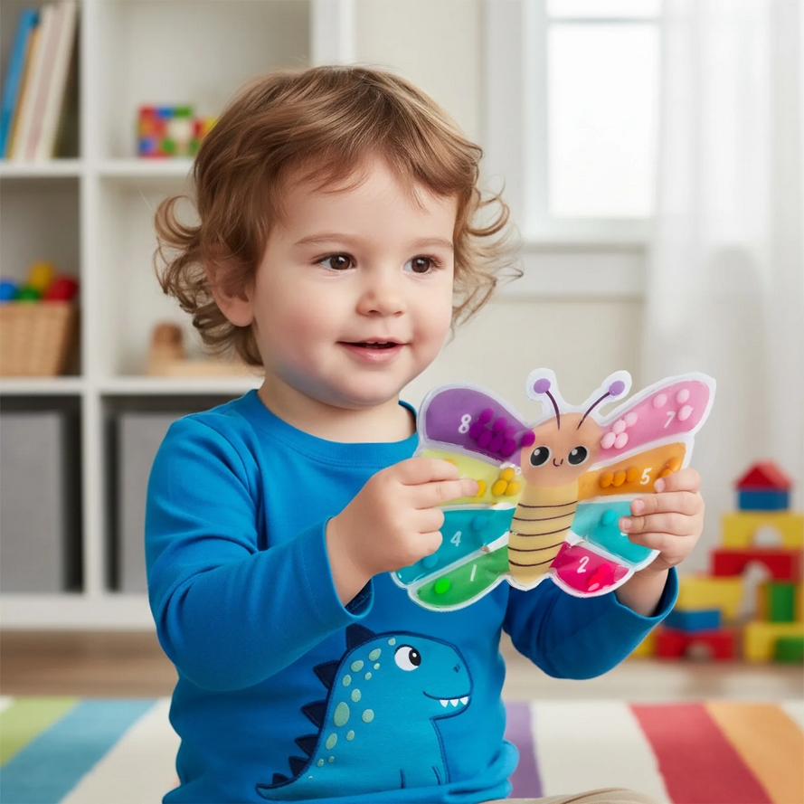 Poznaj wyjątkową sensoryczną planszę motylka z miękkimi, kolorowymi kuleczkami, które dziecko przesuwa do odpowiednich miejsc, dopasowując je kolorystycznie i ilościowo. To idealna zabawka wspierająca naukę liczenia, rozpoznawania kolorów oraz rozwój motoryki małej.