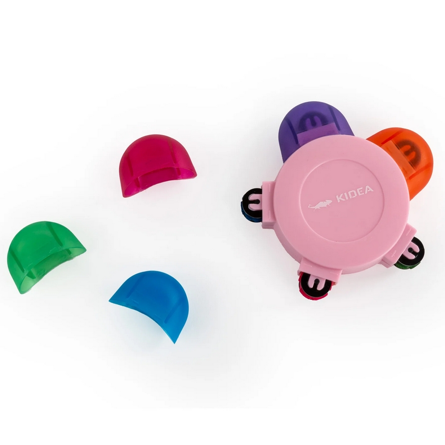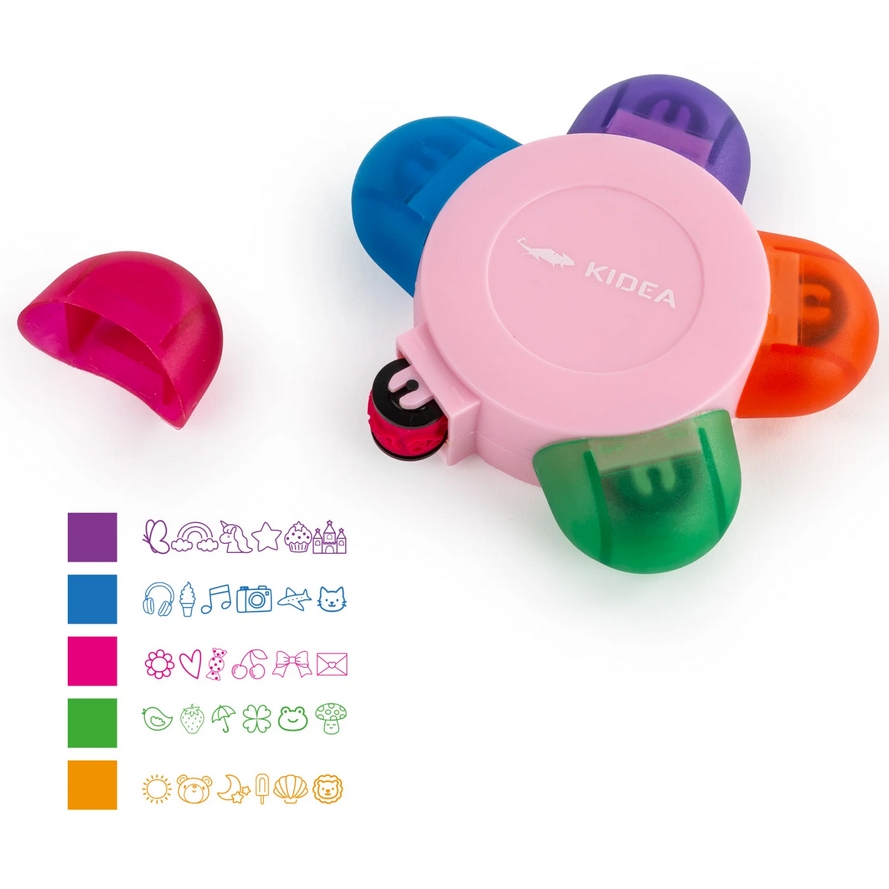 Dodaj magii swoim projektom dzięki samotuszującemu rollerowi dekoracyjnemu w kształcie kwiatka. Każdy kolor posiada unikatowy wzór, dzięki czemu możesz tworzyć kreatywne, efektowne ozdoby na kartkach, zaproszeniach i projektach DIY. Fioletowy kolor z motywem magicznym – motylki, tęcza, jednorożce, babeczki, gwiazdki i zamek. Niebieski z motywem wakacyjno-hobbistycznym – muzyka, lody, podróze, kotki, fotografia. Różowy w motywie słodko-miłosnym – kwatki, kokardki, cukierki i wiśnie. Zielony w stylu wiosennym – ptaszki, truskawki parasol, grzybki, żaby i koniczynki. Pomarańczowy z motywem letnim – słońce, lody, muszelki, lew, miś oraz księżyc i gwiazdy.