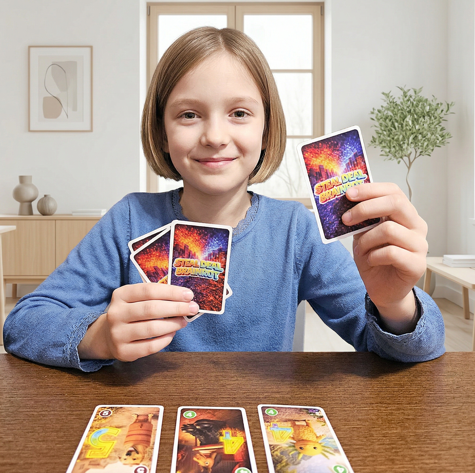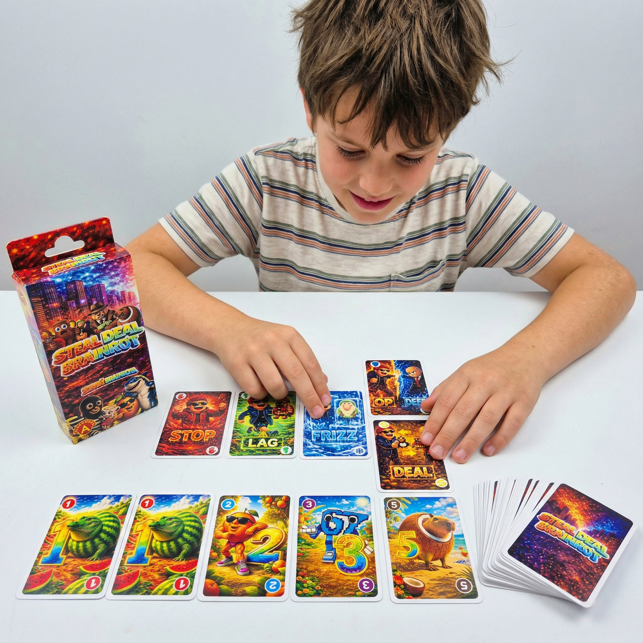 Szybka, pełna zwrotów akcji gra karciana, którą możesz mieć zawsze przy sobie. Steal Deal Brainrot – wersja kieszonkowa to idealny towarzysz podróży, spotkań z przyjaciółmi i każdej chwili, kiedy macie ochotę na dobrą zabawę.