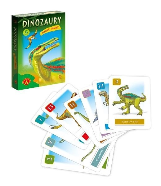 Zestaw 25 kart z wizerunkami dinozaurów, dzięki którym można zagrać z dziećmi w dwie podstawowe gry karciane – „Piotruś” i „Pamięć”. Obie gry wspaniale ćwiczą spostrzegawczość, rozwijają skojarzenia oraz uczą zachowań społecznych. To idealny wstęp dla najmłodszych do świat gier.