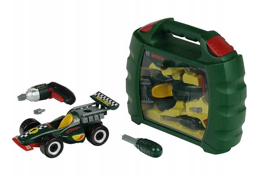 Zestaw zapakowany jest w ciemno-zieloną plastikową walizkę z przezroczystym przednim panelem, przez który widać jej zawartość. Walizka posiada dwa czerwone zatrzaski zamieszczonym po obu stronach wyprofilowanej rączki, zabezpieczając tym samym narzędzia i elementy auta tego kompletu przed przypadkowym wypadnięciem podczas transportu. Zestaw zawiera elementy konstrukcyjne auta w tym podwozie i nadwozie auta wyścigowego w kolorze ciemno-zielonym, cztery duże, plastikowe koła do zamontowania w aucie, zielony i czerwony spoiler, sześć czarnych śrub, a także zestaw naklejek do ozdobienia auta. Bardzo ważnym elementem tego zestawu ułatwiającym skręcenie i zabawę autem jest bezprzewodowa wkrętarka na baterie (KL 8602) Bosch Ixiolino z jednym dodatkowo wymiennym bitem. Wkrętarka jest solidnie wykonana z dużą dbałością o szczegóły, przez co wiernie naśladuje prawdziwe urządzenie. Wkrętarka jak prawdziwa ma wygodny uchwyt z gumową powierzchnią ułatwiającą utrzymanie zabawki w dziecięcych dłoniach, ma możliwość przełączenia za pomocą czerwonego przesuwaka obrotu końcówki w prawo i w lewo. W zestawie jest także śrubokręt z zieloną rączką, który pozwala na manualne skręcenie auta tego zestawu.