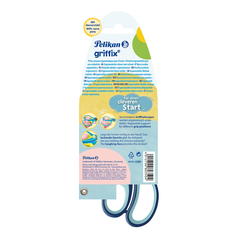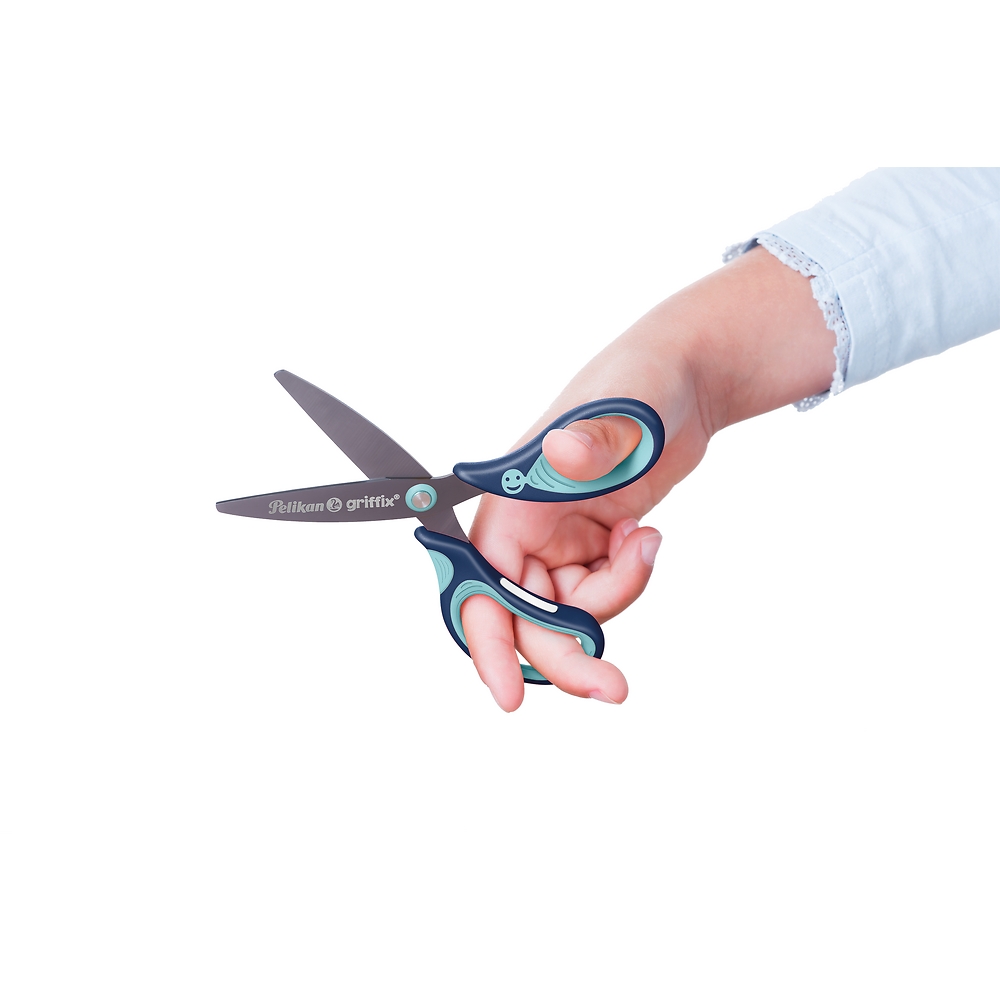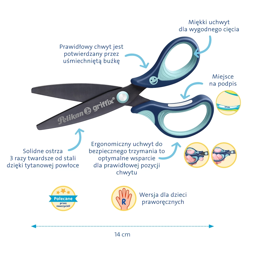 Zaokrąglone nożyczki Pelikan Griffix zostały zaprojektowane specjalnie z myślą o dzieciach – tak, aby były bezpieczne, wygodne i wspierały rozwój prawidłowego chwytu. Ich ostrza pokryte tytanową powłoką są aż 3 razy twardsze od stali, co zapewnia precyzję cięcia i wyjątkową trwałość. Dzięki ergonomicznemu, miękkiemu uchwytowi, nożyczki doskonale leżą w dziecięcej dłoni i nie powodują zmęczenia. Prawidłowy sposób trzymania narzędzia sygnalizowany jest przez widoczną uśmiechniętą buźkę – charakterystyczny znak kolekcji Griffix. Zaokrąglone końcówki ostrzy oraz niewielka waga sprawiają, że nożyczki są w pełni bezpieczne dla młodszych użytkowników. Długość 14 cm to uniwersalny rozmiar, który świetnie sprawdza się w szkole i w domu, a miejsce na podpis pomaga uniknąć pomyłek w klasie czy piórniku.