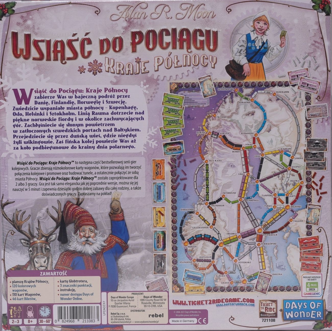 Wsiąść do Pociągu: Kraje Północy to wyjątkowa edycja popularnej gry rodzinnej, w której zbieramy karty przedstawiające wagony i używamy ich, by budować dworce, pokonywać tunele i wsiadać na promy. Specjalna mapa Skandynawii została zaprojektowana do rozgrywek dwu– i trzyosobowych, a gra stanowi samodzielną wersję podstawową i zawiera wszystko, co niezbędne, by rozgrywać swoje partie – nie tylko zimą!
