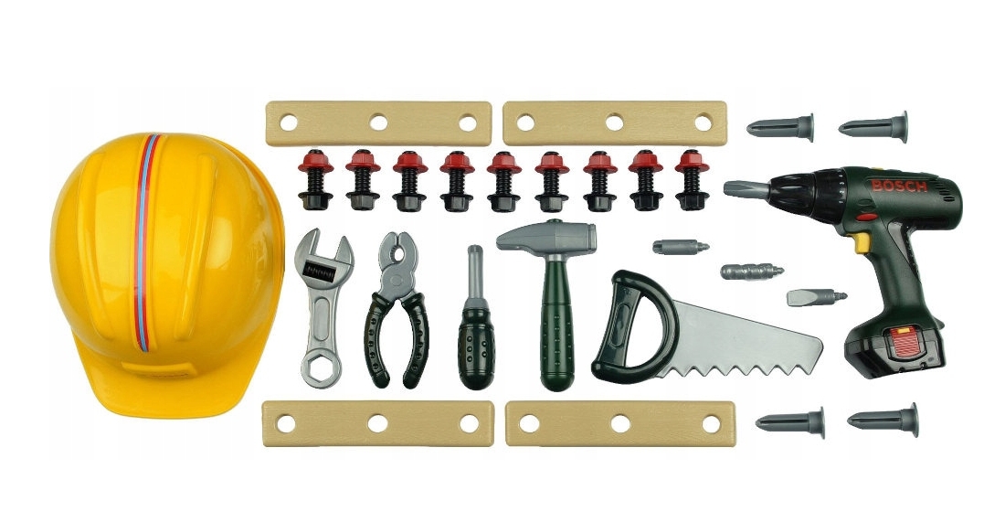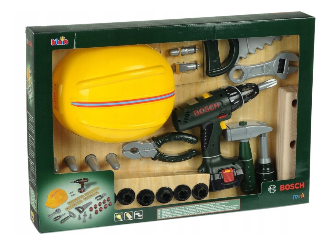 W zestawie w zapakowanym w zielony kartonik Klein, znajdziemy wiertarko-wkrętarkę Bosch(KL8567), kask ochronny(KL 8127), a także narzędzia i akcesoria. Wiertarko-wkrętarka ma regulowane obroty w prawą i lewą stronę, włączane czerwonym przyciskiem, z boku zabawki, jak również dwie prędkości pracy, regulowane czerwonym przełącznikiem na czole urządzenia. Dodatkowo w komplecie są cztery srebrne wymienne bity (wiertła), a także w podstawie urządzenia białą diodę oświetlającą miejsce pracy. Zabawka jak prawdziwa ma wygodny uchwyt z gumową powierzchnią ułatwiającą utrzymanie zabawki w dziecięcych dłoniach. a ponadto podczas swojej pracy wydaje realistyczne dźwięki imitujące odgłosy pracy prawdziwego urządzenia. Pozostałe akcesoria zestawu do kreatywnej i bezpiecznej zabawy to kask ochronny, młotek, śrubokręt, kombinerki, piła ręczna i klucz francuski, a także cztery deseczki z otworami do wkręcania śrub, 9 śrub z nakrętkami i 4 plastikowe gwoździe. Wszystkie elementy zestawu są wykonane z plastiku, pozbawione ostrych krawędzi i całkowicie bezpieczne dla dziecka.