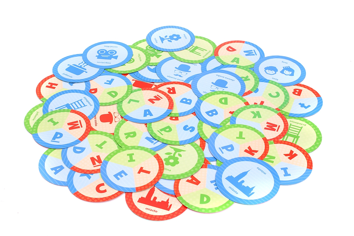 - Każda z liter ma inny kolor. Jedna nich jest tego samego koloru co karta kategorii na wierzchu talii.