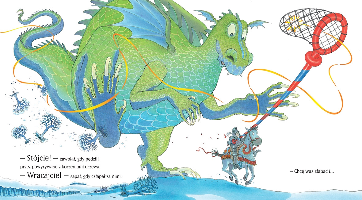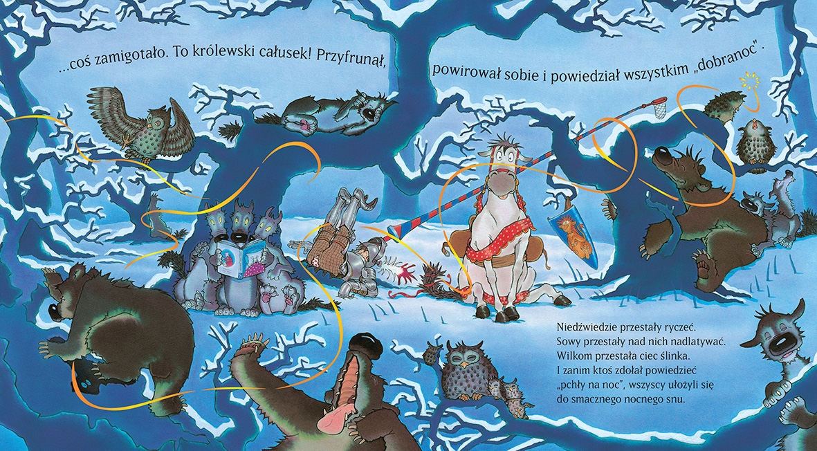 Król zawsze się śpieszy i w pośpiechu posyła synkowi całusa na dobranoc. Ale nie trafia. Całusek wylatuje przez okno i umyka. Rycerz wyrusza na poszukiwanie przez dziki las, wśród dzikich stworów, mroku i śniegu, aż wreszcie napotka ogromnego, zgłodniałego smoka. Ale zjawi się całusek, który pokona wszelkie zło.