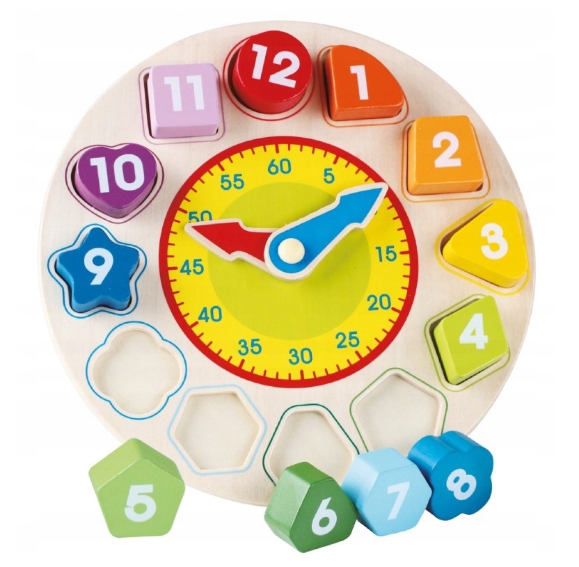 Wyjmowane ponumerowane klocki, o różnych kształtach i kolorach, pomogą prawidłowo umiejscowić odpowiednią godzinę na tarczy zegara.